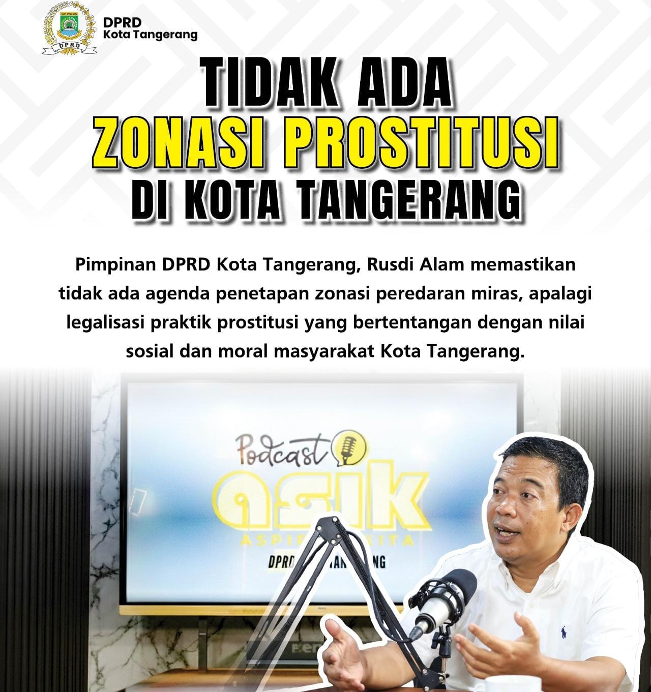 “Mengenai isu zonasi prostitusi tidak pernah menjadi bagian dari agenda prolegda 2026. DPRD bersama Pemkot Tangerang berkomitmen menjaga ketertiban sosial melalui penguatan regulasi yang relevan dengan perkembangan zaman,” terang Rusdi.